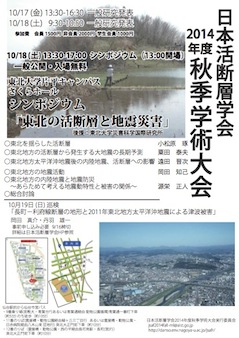日本活断層学会2014年度秋季学術大会の開催がいよいよ近づいてきました。今季は一般公開シンポジウム「東北の活断層と地震災害」を併せて開催します。多数の皆様の御参加をお待ちしております。